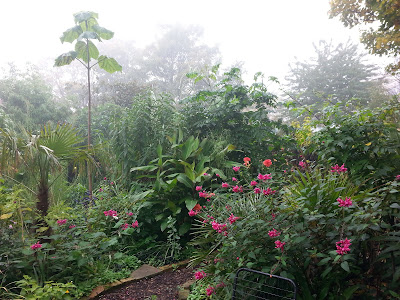 Although it looks like most of the garden here is tender, there are actually only a few things that need to come in namely:Brugmansias and Musa sikkimensis which were moved under cover with the huge M. sikkimensis being pushed up against the side of the house and wrapped in fleece.
